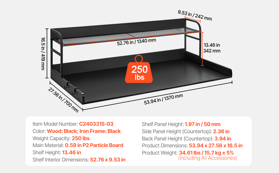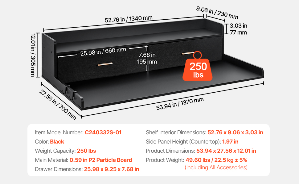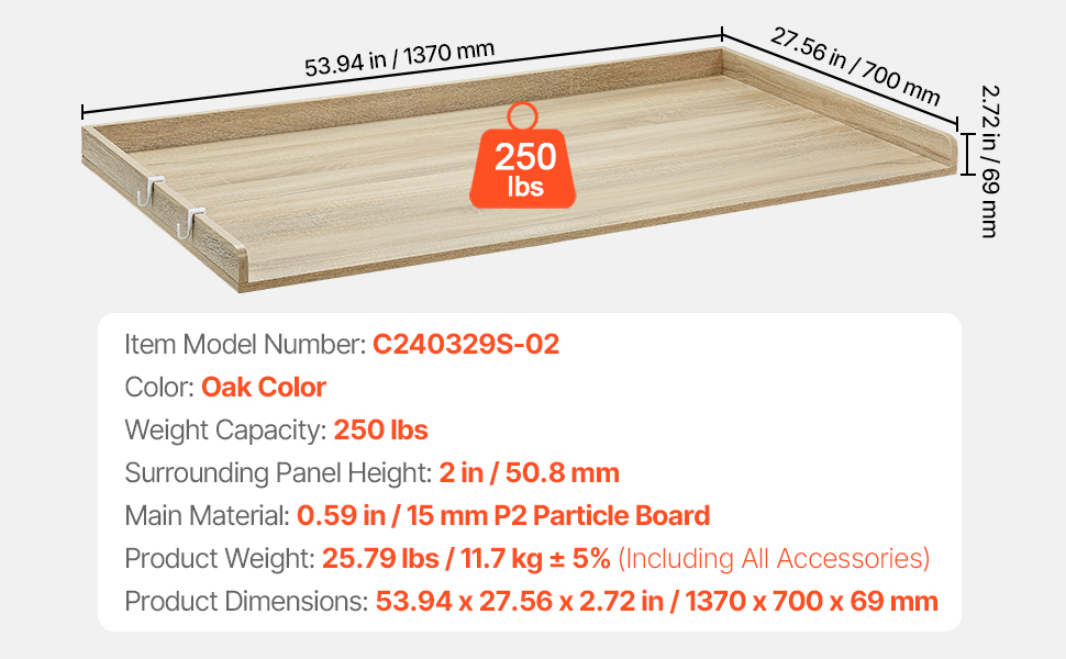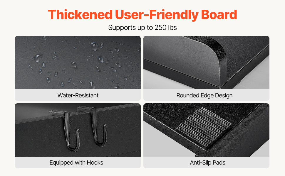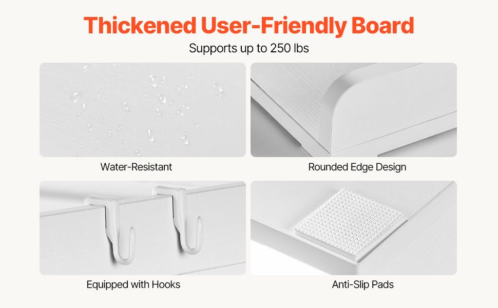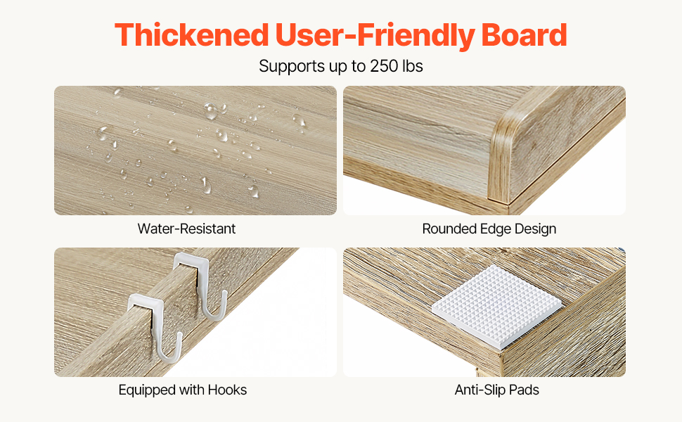 Made from high-quality P2 CARB wood, with a 15mm thick surface, this friendly material is heat, water, and scratch resistant, supporting up to 250 lbs. Equipped with practical side hooks for hanging small items, it’s built to withstand daily use and ensures long-lasting stability.