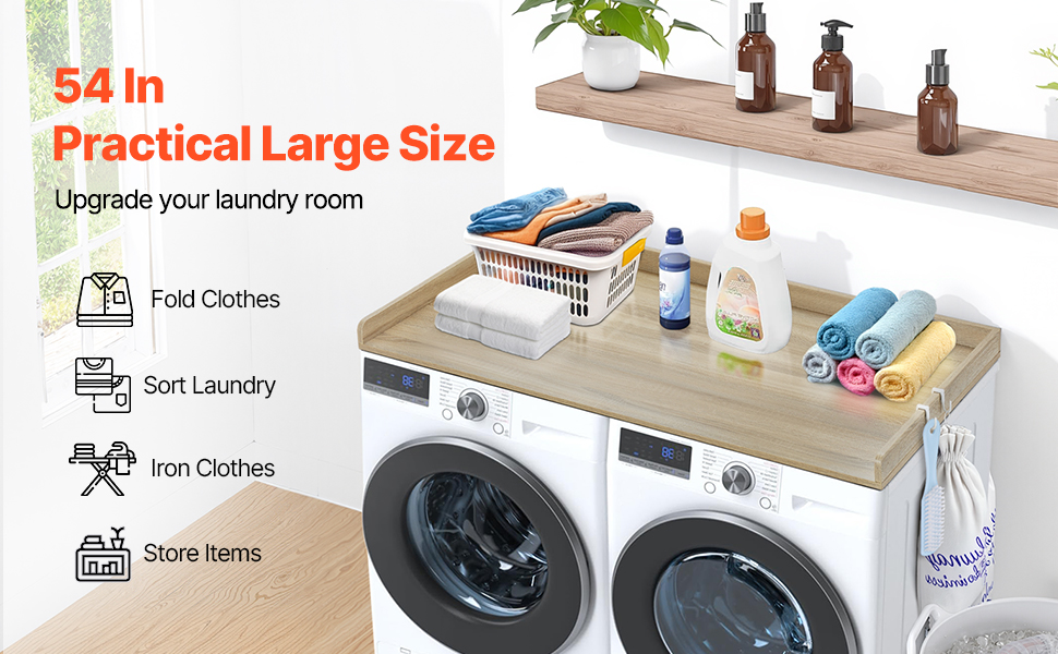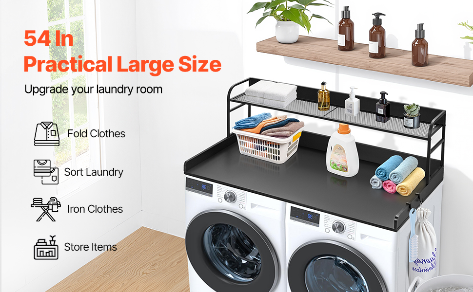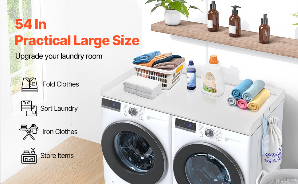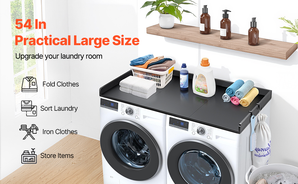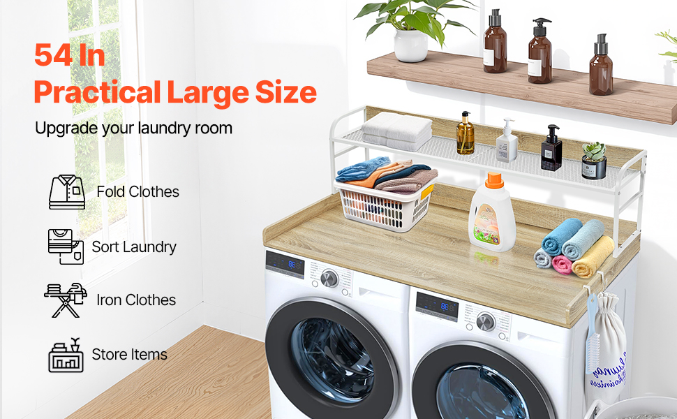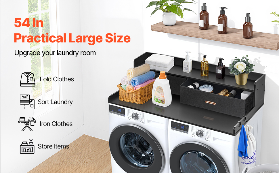 • Functional Space: With a spacious surface measuring 54 inches in length and 27 inches in width, this laundry room organization transforms your laundry room into a functional workspace. It offers ample room for folding, ironing, and other laundry tasks.