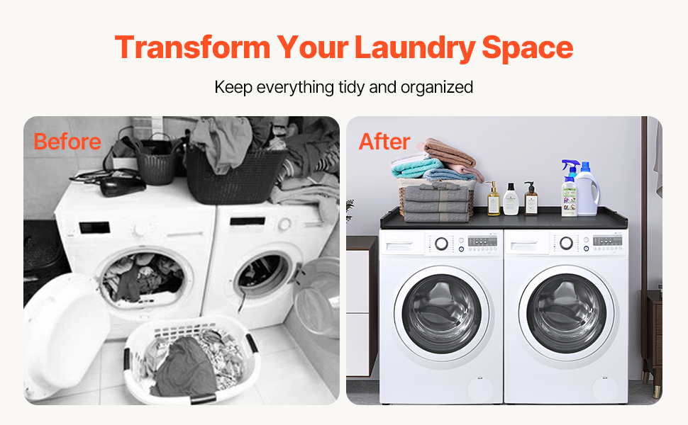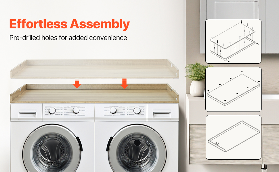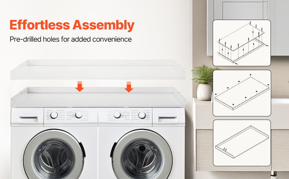 • Easy to Assemble: Comes with all necessary instructions and accessories for quick assembly. The pre-drilled holes allow for a simple setup in just a few minutes. The washer and dryer countertop also includes eight anti-slip pads to protect your surfaces and prevent movement.