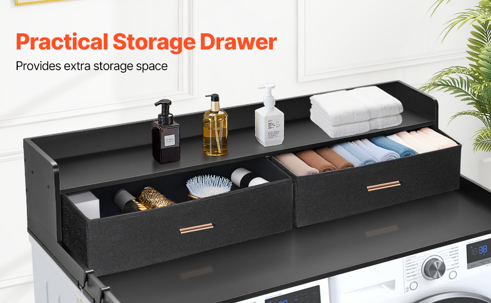 • Practical Storage Drawers: Equipped with two practical drawers, this washer dryer countertop makes it easy to store items like socks, clips, clotheslines and other small essentials. Everything is within reach, keeping your laundry area neat and efficient.