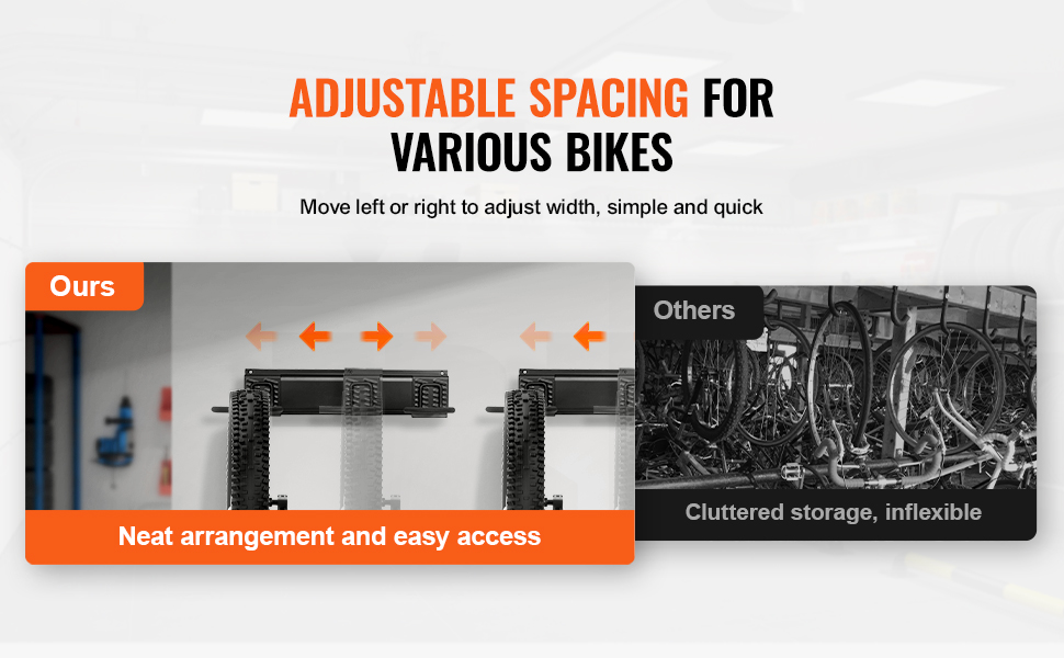 Adjustable Spacing: The bike wall rack's hooks are attached to the rail with a slot-and-slide mechanism, allowing the hooks to move laterally. This design lets you adjust the spacing between hooks to fit different bicycle types. Tailor the setup to your specific storage needs.