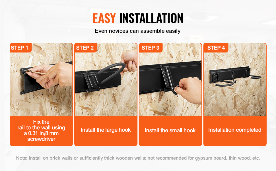 Install with Ease: Setting up this hanging bike rack is a breeze—just grab a 0.31 in/8 mm screwdriver and you're set. We recommend mounting it on solid walls like brick or sturdy wood with sufficient thickness to ensure stability and security.