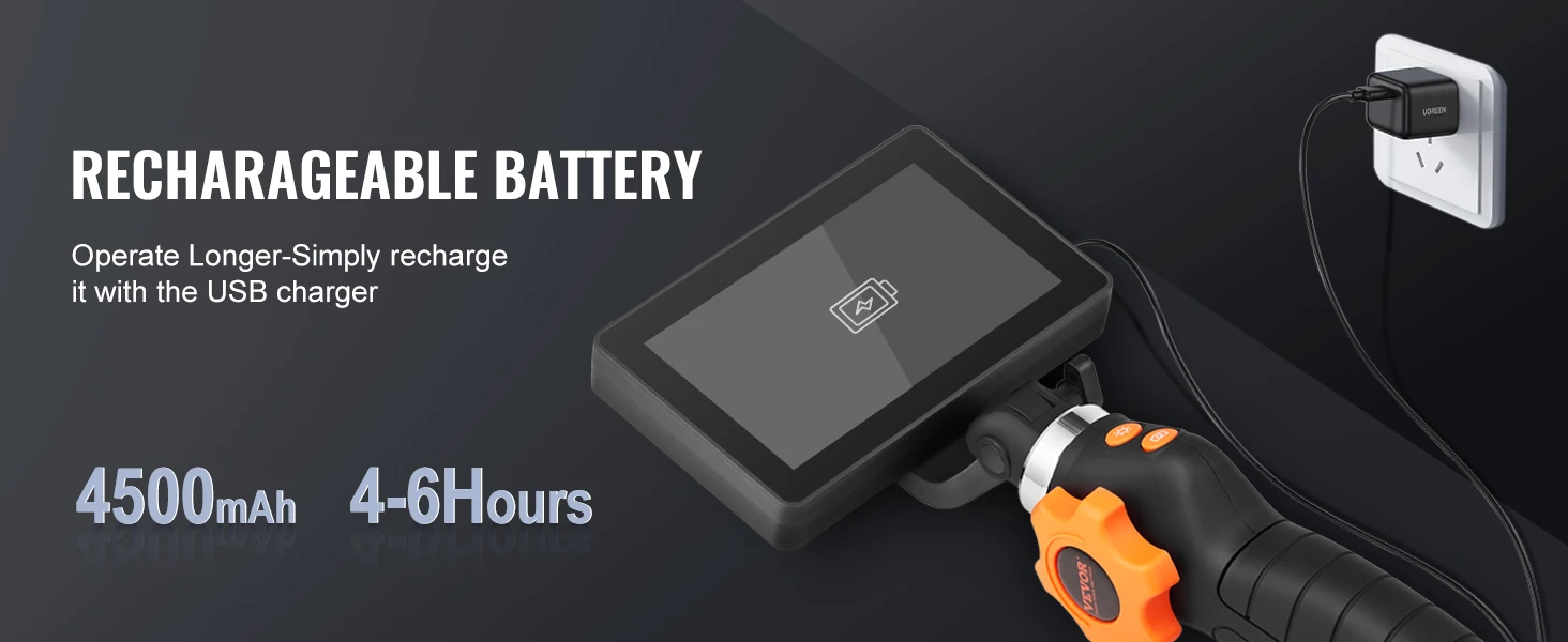 Operate Longer & Store More: Our inspection camera with 4500mAh high-capacity battery can support up to 4-6 hours of continuous operation. The type C interface is easy to plug and unplug, once you're done, simply recharge the device with provided USB charger. We also include a 32 GB TF card that stores pictures and videos for your further analysis.