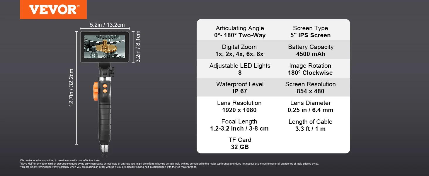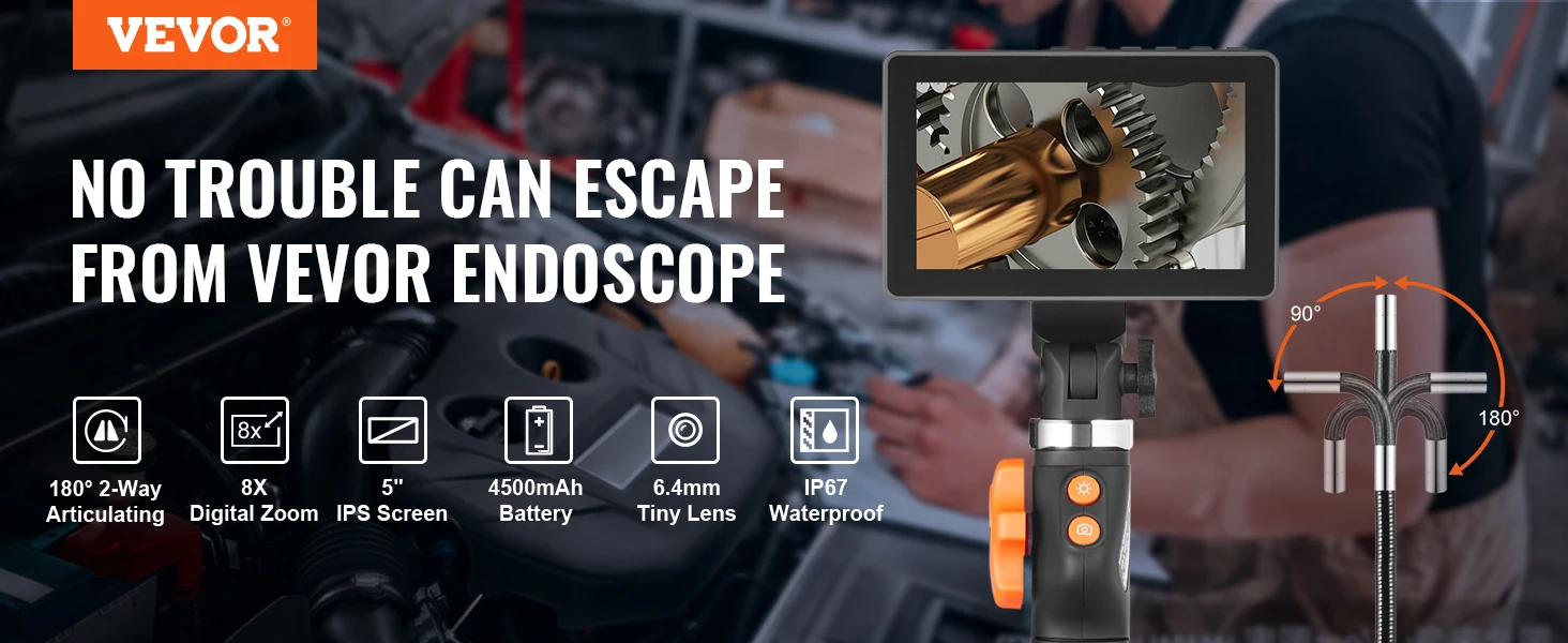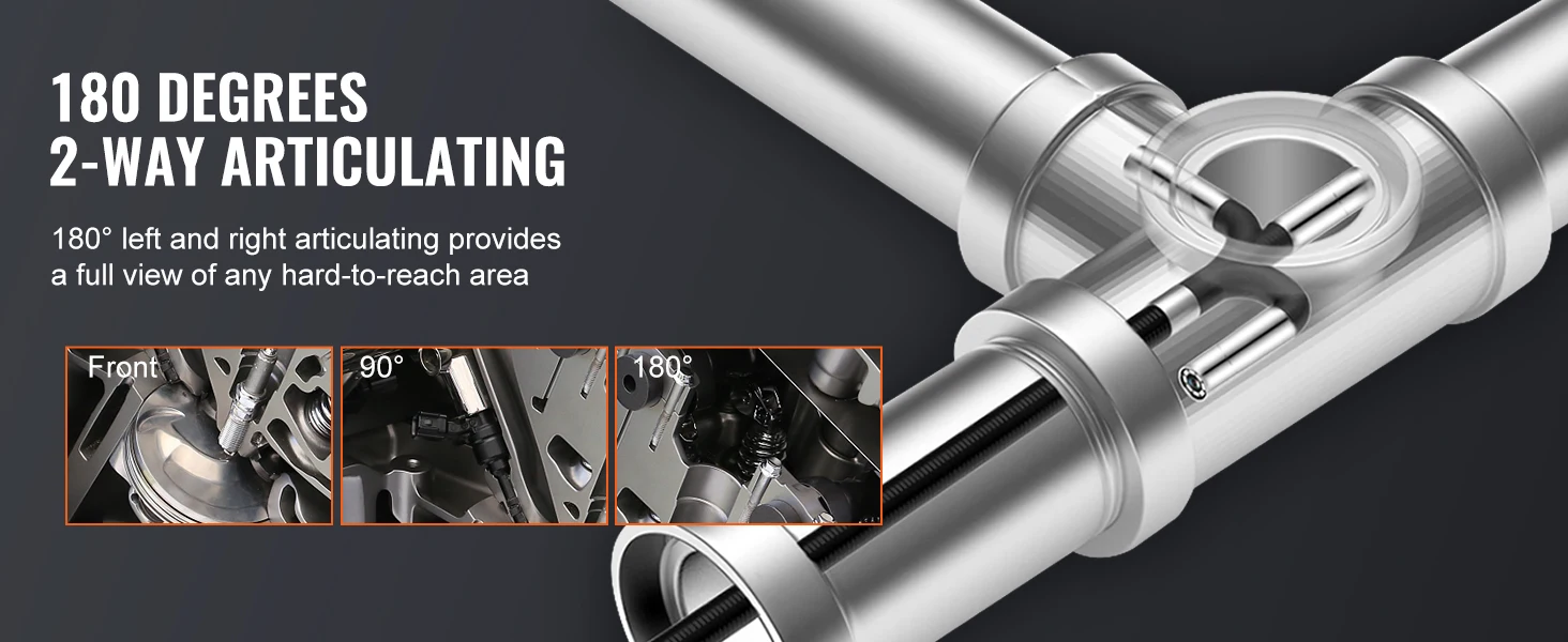 Two-Way 180°Articulating: VEVOR endoscope adopts advanced 180-degree bi-directional steering technology, allowing the lens to rotate 180 degrees to the left and right. Enable you to examine areas from different angles and easily inspect the deepest and most inaccessible corners. Whether it's the intricate components inside the engine or the complex circuit layout, everything can be seen clearly. No need for frequent cable rotation, just rotate the camera direction control wheel to inspect different areas from all-round angles.