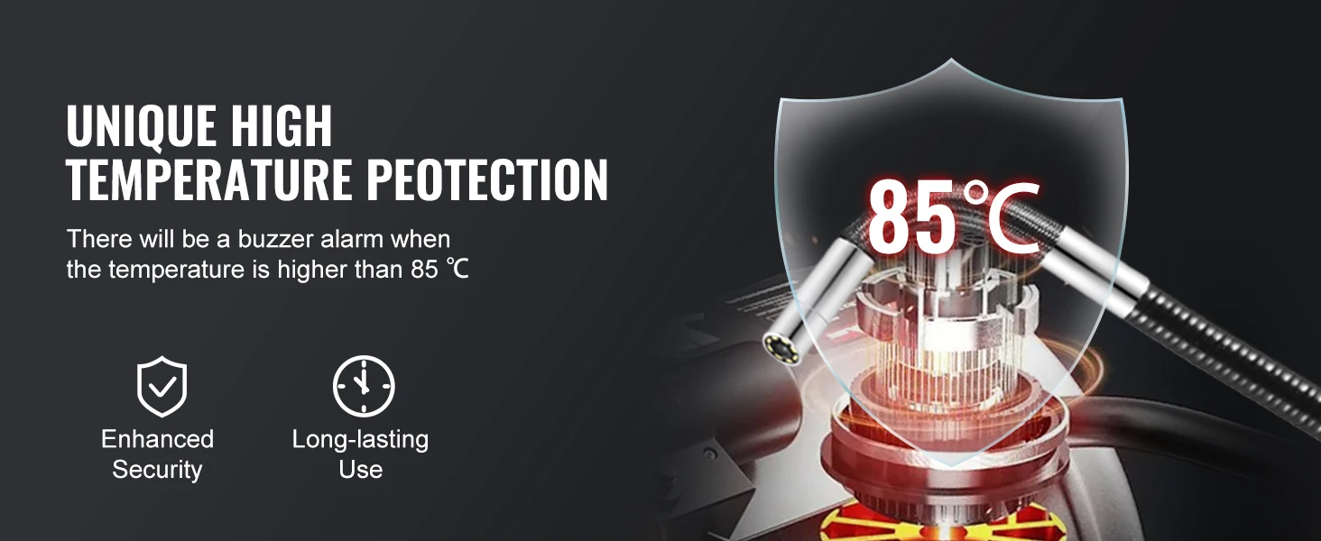 6.4mm Ultra Tiny Camera: Compared to others 8.5mm lens, our 6.4mm IP67 waterproof ultra slim lens allows easier access to the difficult-to-reach areas. The borescope camera with 8 lights and 3 adjustable brightness levels provide enough light for darker situations. Unique high-temperature protection will also well protect your endoscope, when the lens temperature exceeds 85℃, the camera will trigger a buzzer alarm to alert the user to the high-temperature condition.