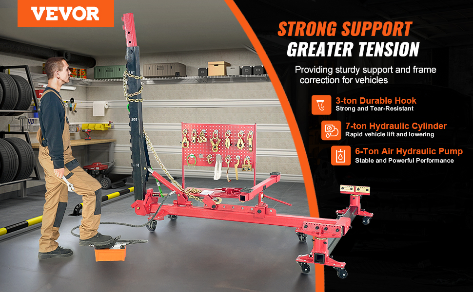 6-Ton Strong Tensile Force: The auto body frame straightener features a robust 7-ton hydraulic cylinder and a hydraulic air pump, delivering exceptional tensile strength for repairing vehicle body dents and deformations. It includes a 3m iron chain for high-strength tension and stability, ensuring a reliable repair process.