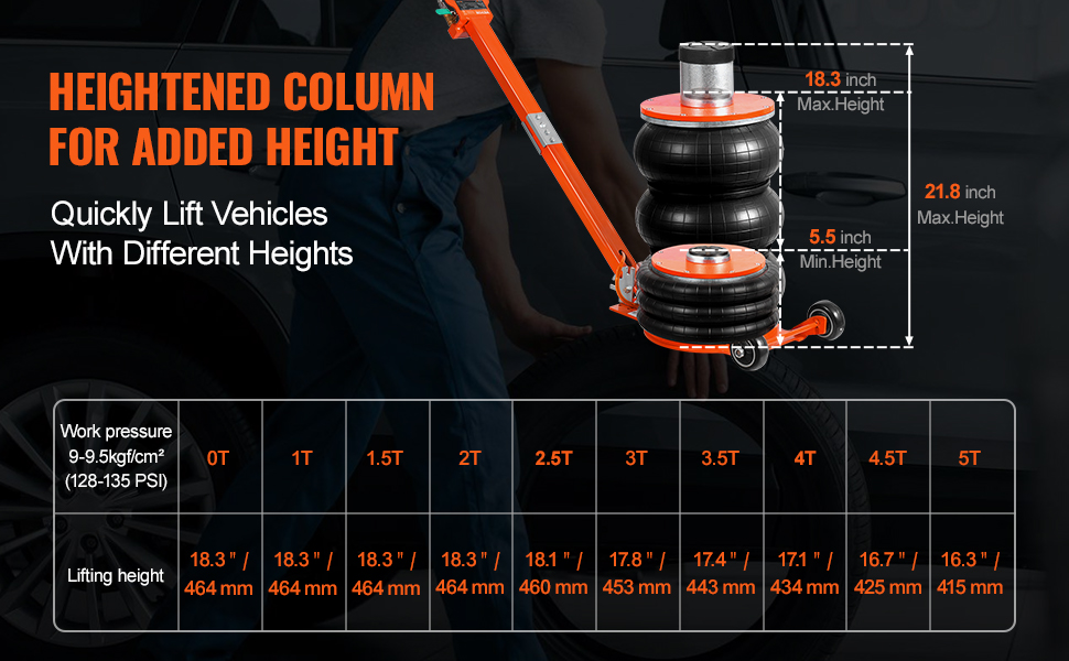 Lifting Height: Upgraded with heightened column, the air drag’s lifting range is 9.1-21.8 in/230-554mm (including booster column), which is more helpful for adapting to the maintenance needs of vehicles of different heights. Without heightened column, the minimum height is 5.5 in/140 mm, which is more conducive to the access to the low chassis vehicles.
