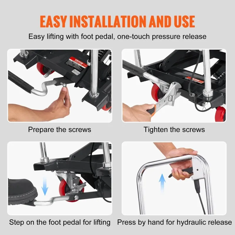 Premium Hydraulic Pump: Experience impressive lift heights up to 28.5 inches with VEVOR hydraulic lift table cart. Our high-quality integrated hydraulic pump ensures efficient and reliable lifting without any oil leakage issues. Get the power you need for smooth and controlled lifting performance.