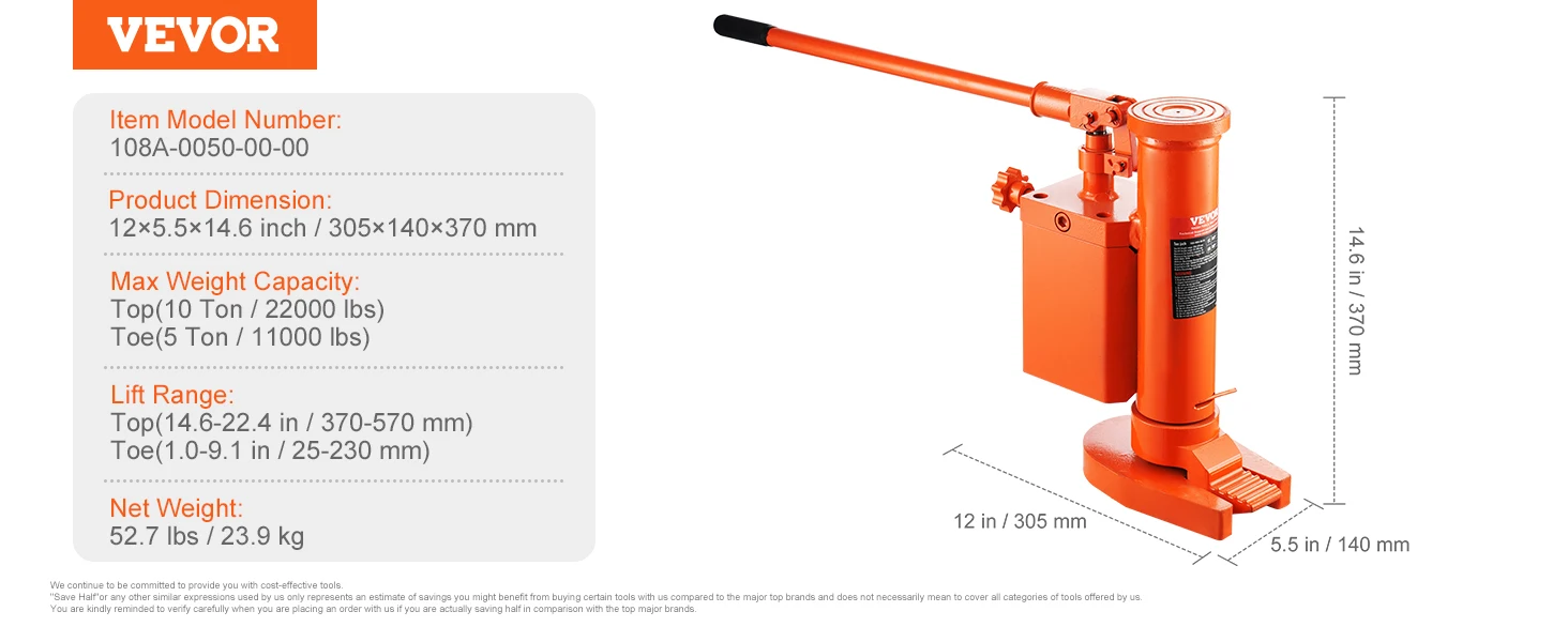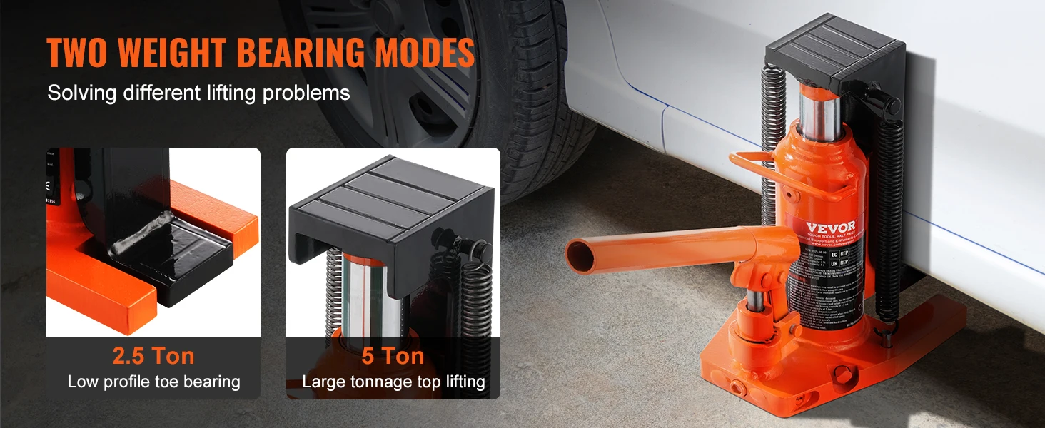 Robust Weight Capacity: With a lifting capacity of up to 5 tons (top) and 2.5 tons (toe), it's ideal for automotive and industrial lifting tasks. Safely lift vehicles with ease, making lifting effortless and manageable for a single operator.