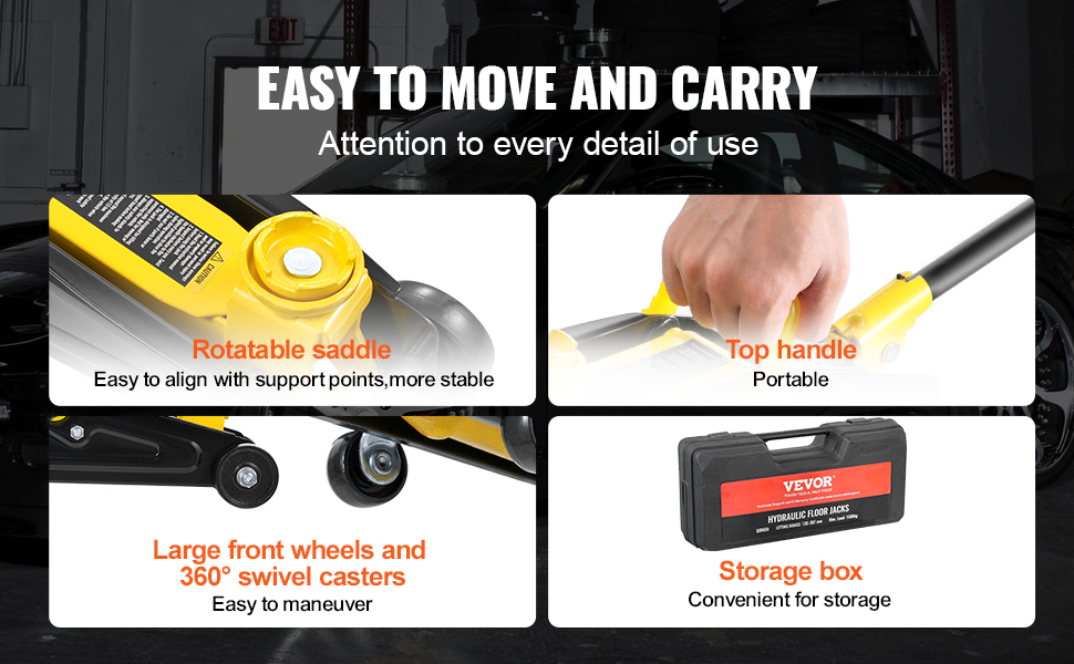 Convenient Design: The rotating saddle allows for easy adjustment and alignment with support points during use, providing additional protection for your vehicle. The jack features 2 large rear wheels and 2 swivel casters for smooth rolling, making it easy to maneuver and position. The top handle facilitates lifting the jack, and the included storage box ensures convenient storage and portability.