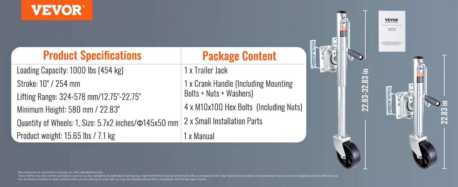 Heavy-Duty Load Capacity: The VEVOR trailer jack boasts an impressive lifting capacity of 2000/1500/1000 lbs, making it a powerful tool for lifting tasks. With a lifting range of 12.51 to 22.52 inches, it fits for no matter high-profile or low-profile trailers.