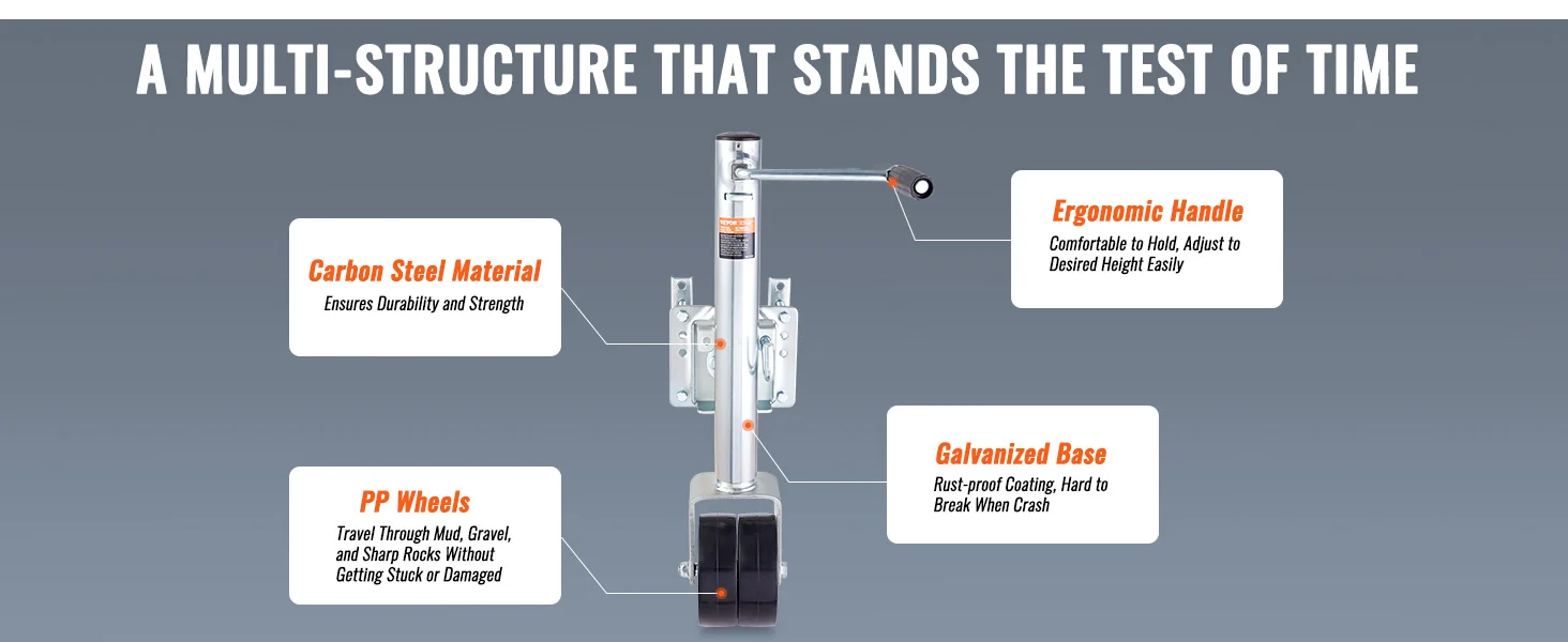 Designed for Stability & Durability: This trailer jack stand is engineered to deliver exceptional stability and long-lasting performance. Crafted from heavy-duty carbon steel, it offers maximum strength and rigidity. The galvanized inner and outer tubes and powder finish provide enhanced corrosion resistance.