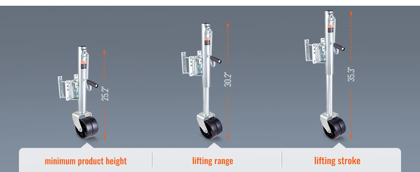 Easy Installation: Our boat trailer jack comes with all the necessary parts and detailed assembly instructions. It can be bolted or welded onto the trailer tongue and has a swivel function that allows it to swing up parallel to the tongue for easy maneuverability.