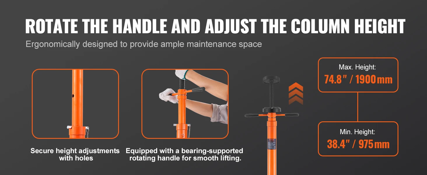 Dual Quick Height Adjustment: The holes on the main post of the jack stand are used to lock in the primary height levels, and the threaded rod assists in adjusting the height. The spin handle incorporates a thrust bearing, making it easy to raise and lower, even under the extreme pressures of a heavy load. The height adjustment range is 38.4" - 74.8" / 975 - 1900 mm, catering to the bottom clearance requirements during most maintenance tasks.