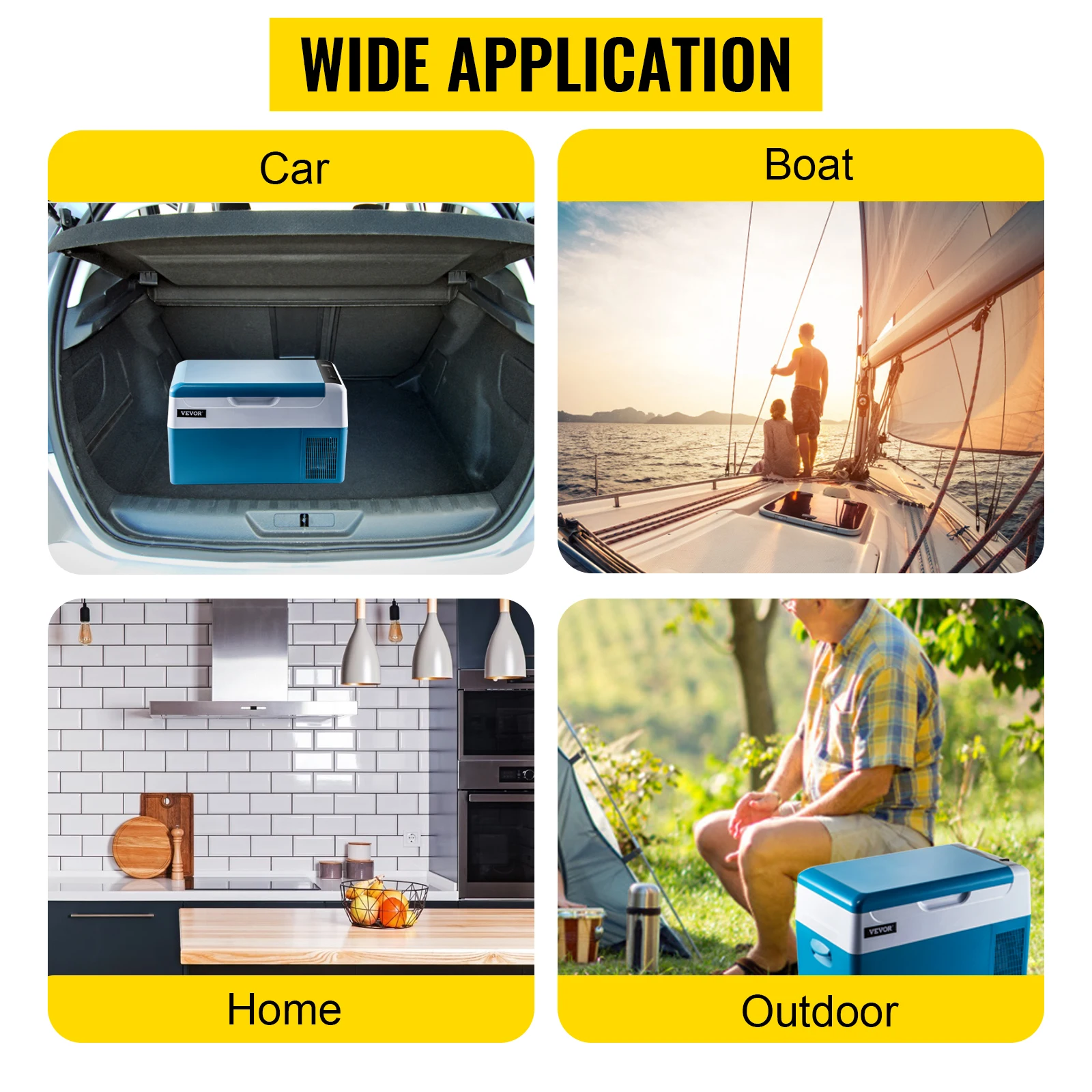 Operating at 12 / 24V DC and 110-240 AC, the 12V refrigerator freezer can be connected to an automobile cigarette lighter and household power supply. A portable compressor refrigerator is suitable for RV, campsite, boat, camping, fishing, road travel, and outdoor activities.