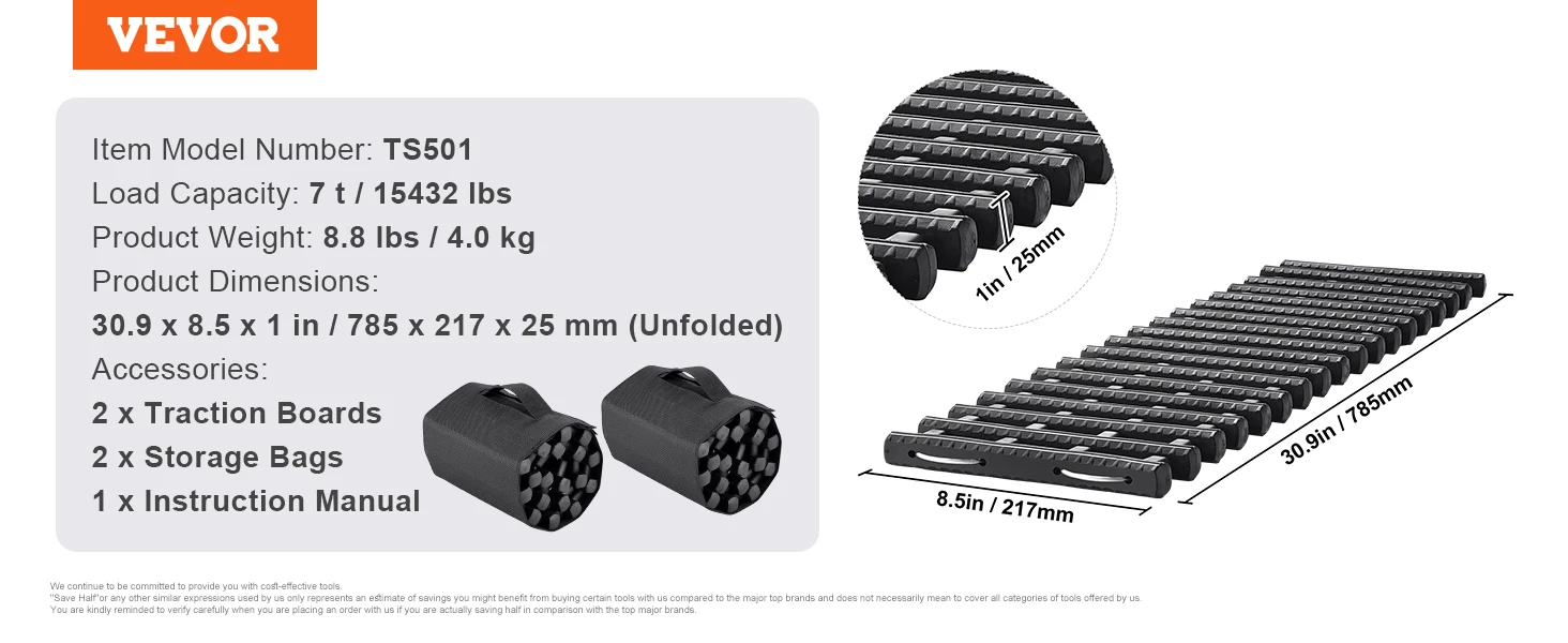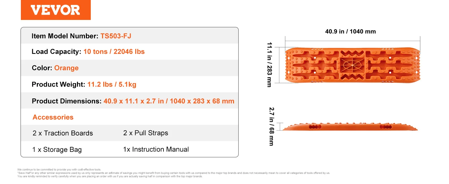 10-Ton Load Capacity: With a maximum load capacity of up to 10 tons (22,046 lbs), the traction boards can support various vehicles, including SUVs, RVs, cars, and trucks. Even large vehicles can be quickly rescued with this board.