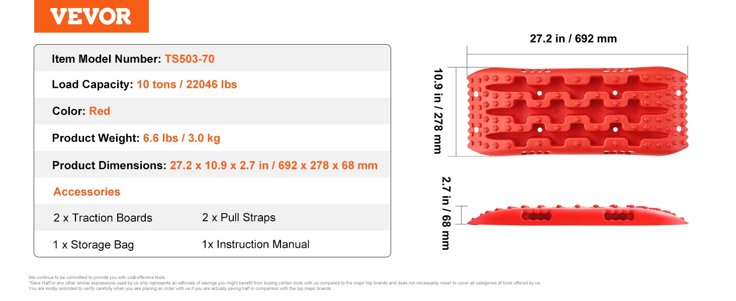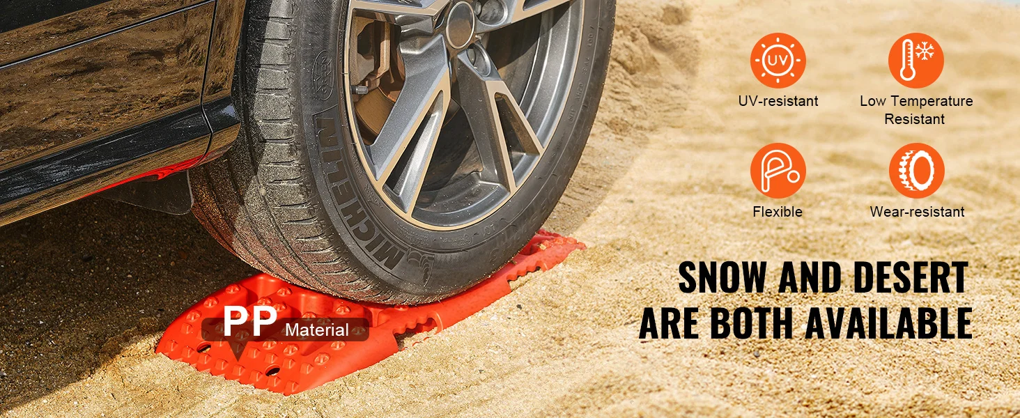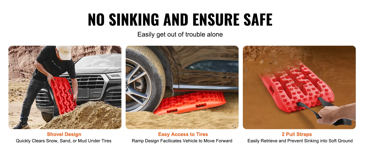 Reliable & Sturdy: The recovery traction mats have sloped ends that can double as shovels to easily clear sand or snow from the tires. The sloped design facilitates tire engagement and traction. Equipped with two pull straps, it is easy to pick up and deploy. Simply place the board under the wheels and follow the instructions to help your vehicle escape from mud, sand, or snow.