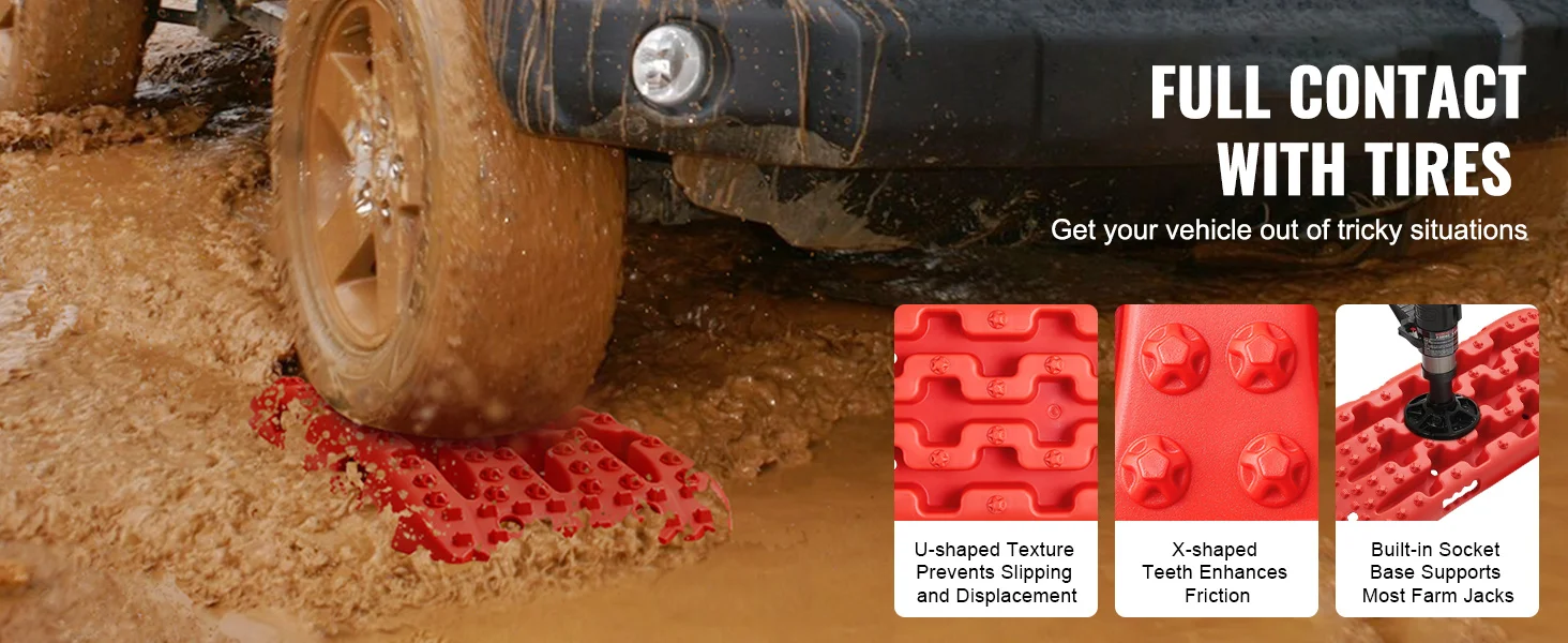 Non-Slip Tooth Design: The surface features a cross-tooth and U-shaped groove design, ensuring full grip on the tires to prevent slipping or misalignment. The base includes a farm jack socket for added stability during recovery operations.