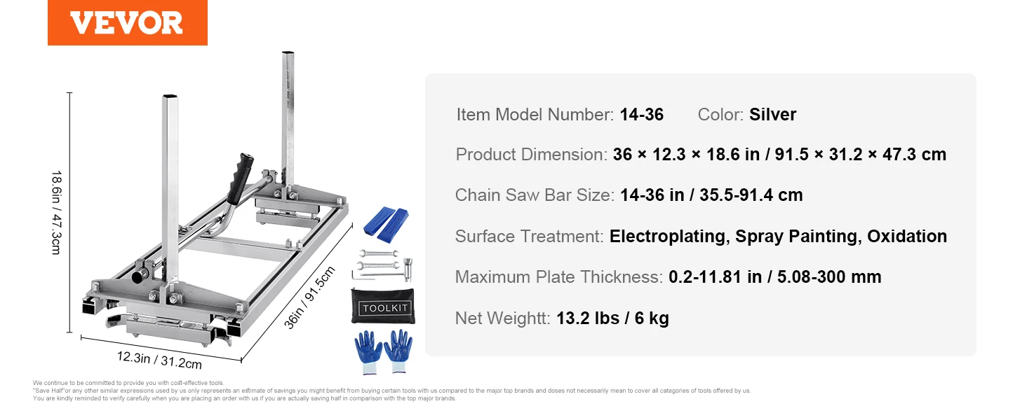 Elevate Your Woodworking to New Heights ! VEVOR portable chainsaw milling is the ultimate tool for achieving perfect woodcuts. 14- 36 inch chainsaw bars and 0.2-11.81 inch adjustable cutting thickness...