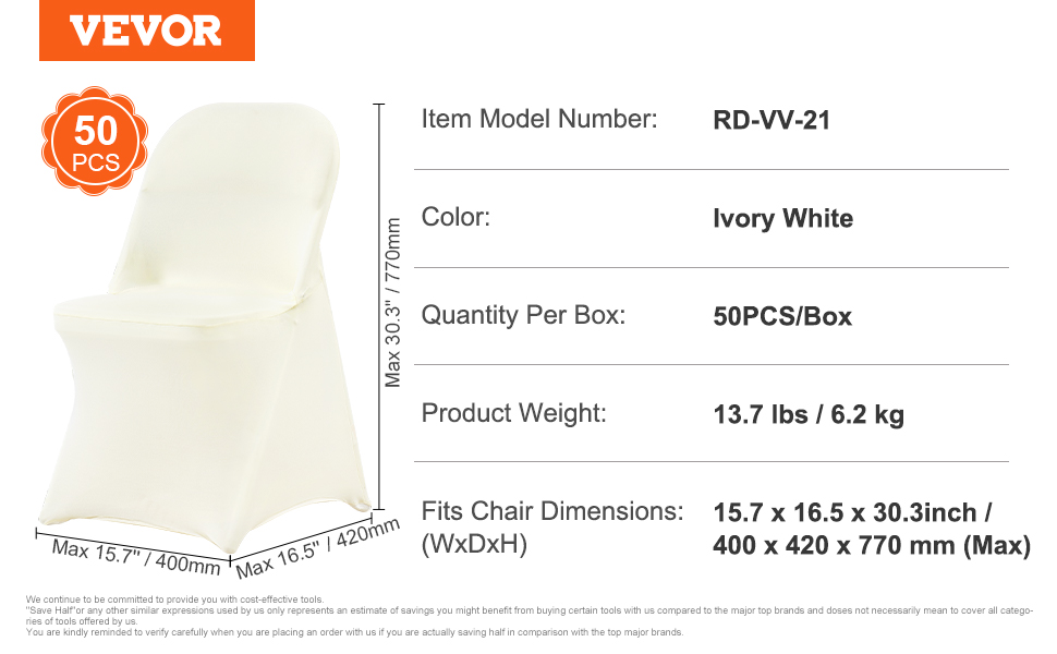Premium Material: Color: Ivory White; Quantity per box: 30 PCS; Material: 95% Polyester Fiber & 5% Spandex. Durable fabric and quality stitching offer additional comfort and elasticity. Universal spandex folding chair covers are designed to protect your chairs from accidental spills, pet scratches, everyday stains, and tears, making them ideal for both indoor and outdoor events.