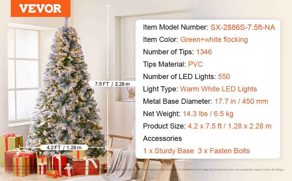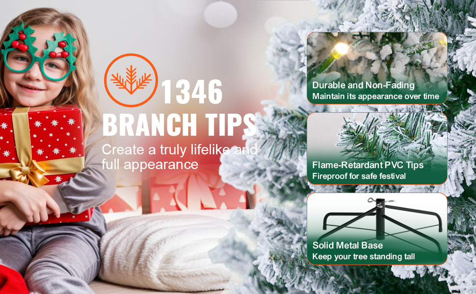 Let VEVOR Prelit Flocked Christmas Tree be the centerpiece of your holiday celebrations, filling your home with warmth and joy. 1346 branch tips make for lush and lifelike appearance, and 550 warm white LED lights creates an enchanting atmosphere for you and your loved ones to cherish.