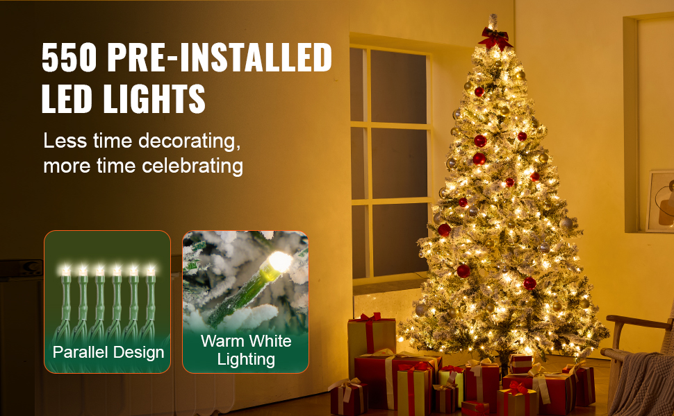 Warm White LED Lights: Enjoy 550 warm white LED lights already strung on the tree, saving you precious decorating time. Designed with parallel lighting, even if one LED light goes out, the rest will stay illuminated, lighting up your wonderful Christmas night!