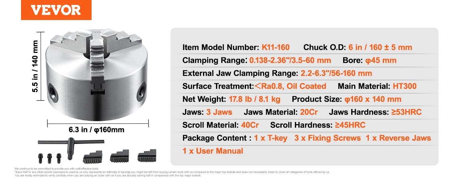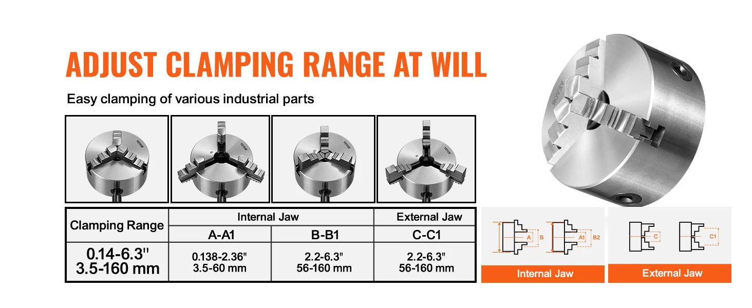 Internal & External Jaw: The 3-jaw self-centering lathe chuck is equipped with an internal jaw and external jaw to expand its clamping range, and the external jaws are capable of clamping larger-sized industrial parts. Clamping Range: 0.14- 6.3 in/3.5-160 mm. All you need to do is rotate it using the T-key and adjust it to fit your workpiece size and shape.