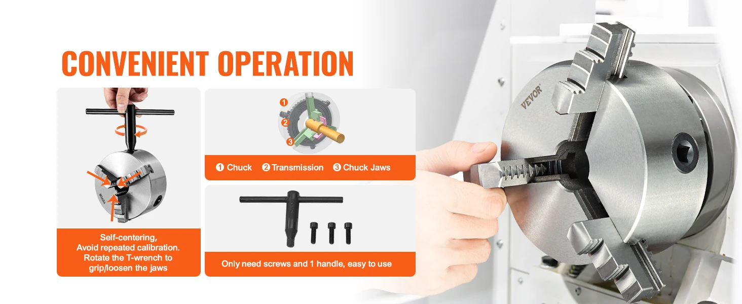 Simple & Easy Operation: The 3-jaw lathe chuck features a simple and compact structure, pursuing the best balance of function and reliability. The built-in self-centering function allows you to use it without repeated calibration. All you need to do is install it in the right order and use it with peace of mind.