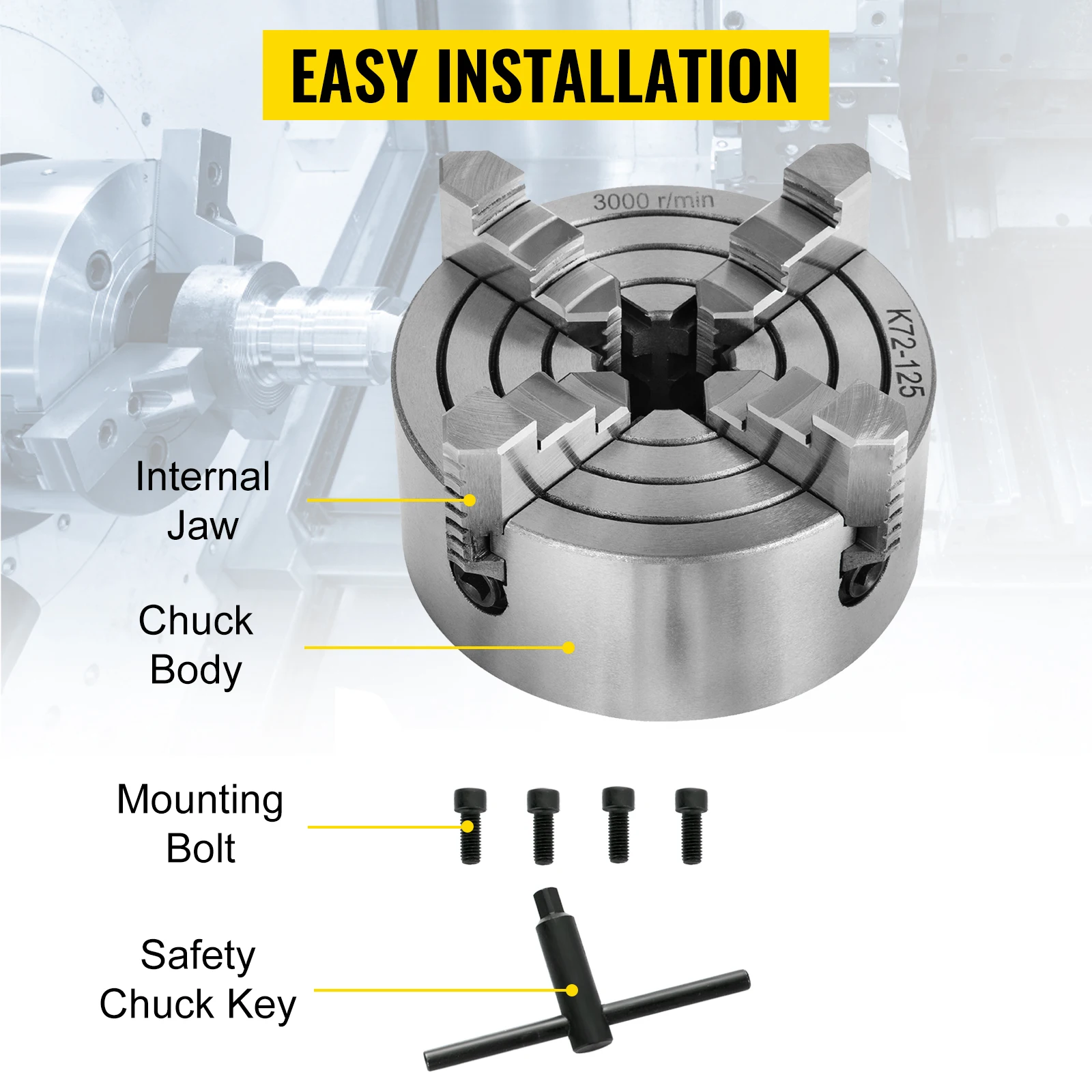 【PREMIUM MATERIAL】 - Diameter: 125 mm (4.92 in) / 100 mm (3.93 in). The 4-jaw mini lathe chuck body is made of cast iron that has passed rigorous quality tests. So it is rigid and durable.