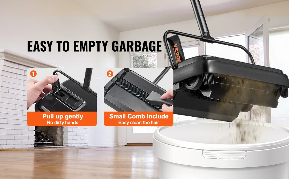 Easy to Empty Garbage: Our manual sweeper is incredibly easy to empty! Simply pull up the clasp, and everything you've swept up effortlessly falls out, keeping your hands clean. Plus, we've included a small cleaning comb to help you remove any hair caught in the brush.
