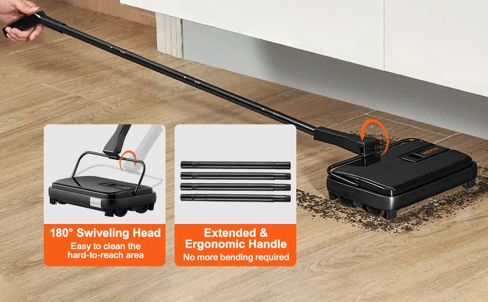 User-Friendly Design: With a 180-degree rotating head, this floor sweeper manual is designed to effortlessly clean hard-to-reach areas under coffee tables, sofas, and even beds. Its extended handle eliminates the need to bend over while cleaning.