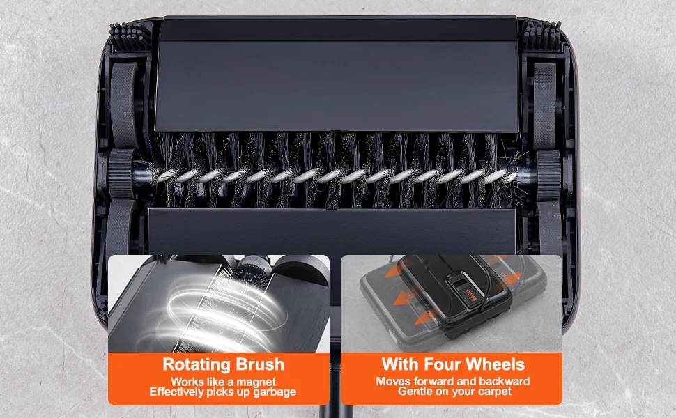 Equipped with a rolling brush and four wheels, our carpet sweeper acts as a powerful magnet, effortlessly attracting and capturing garbage and dirt, leaving surfaces impeccably clean with minimal effort.