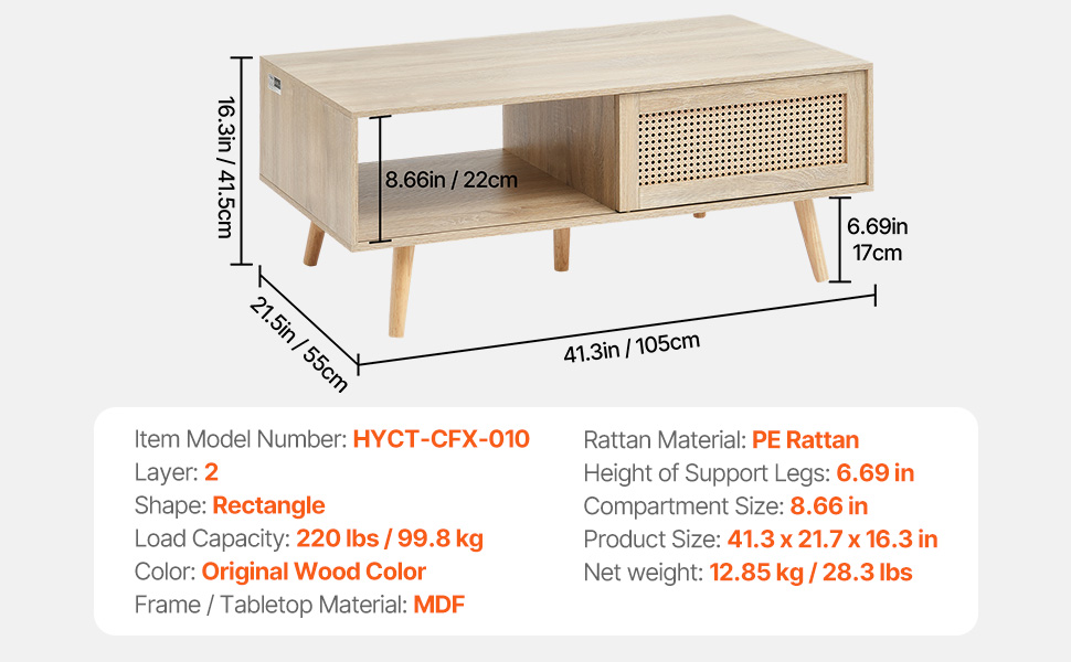 High Quality and Stability: This wood coffee table is constructed with natural rubber wood and PE rattan, providing a solid structure and premium materials. It offers excellent support with a weight capacity of 250 lbs (113.4 kg), holding various items without wobbling or damage.