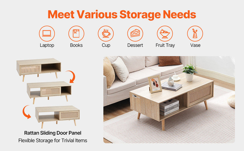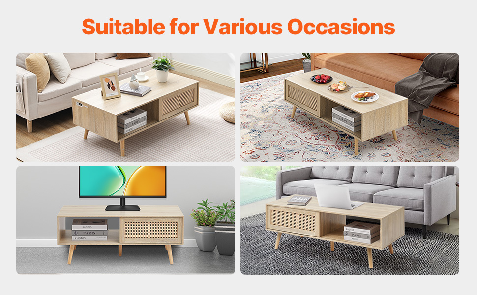 Flexible Storage Space: Our boho coffee table has a closed cabinet with sliding doors for hidden storage and an open shelf for easy access. The cabinet is great for magazines, books, remotes, or snacks, while the tabletop is ideal for photos, decor, or your favorite coffee cup.