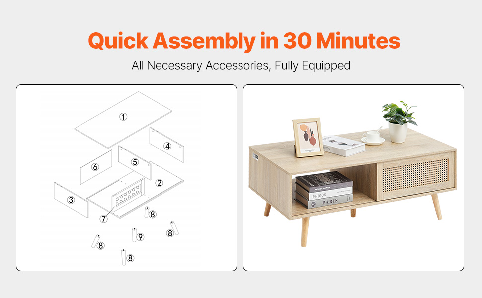 Easy Assembly and Cleaning: This wood coffee table has all the needed parts and a detailed instruction guide to set it up in about 30 minutes. The smooth, waterproof surface is easy to clean - wipe it with a damp cloth.