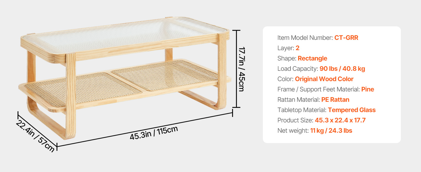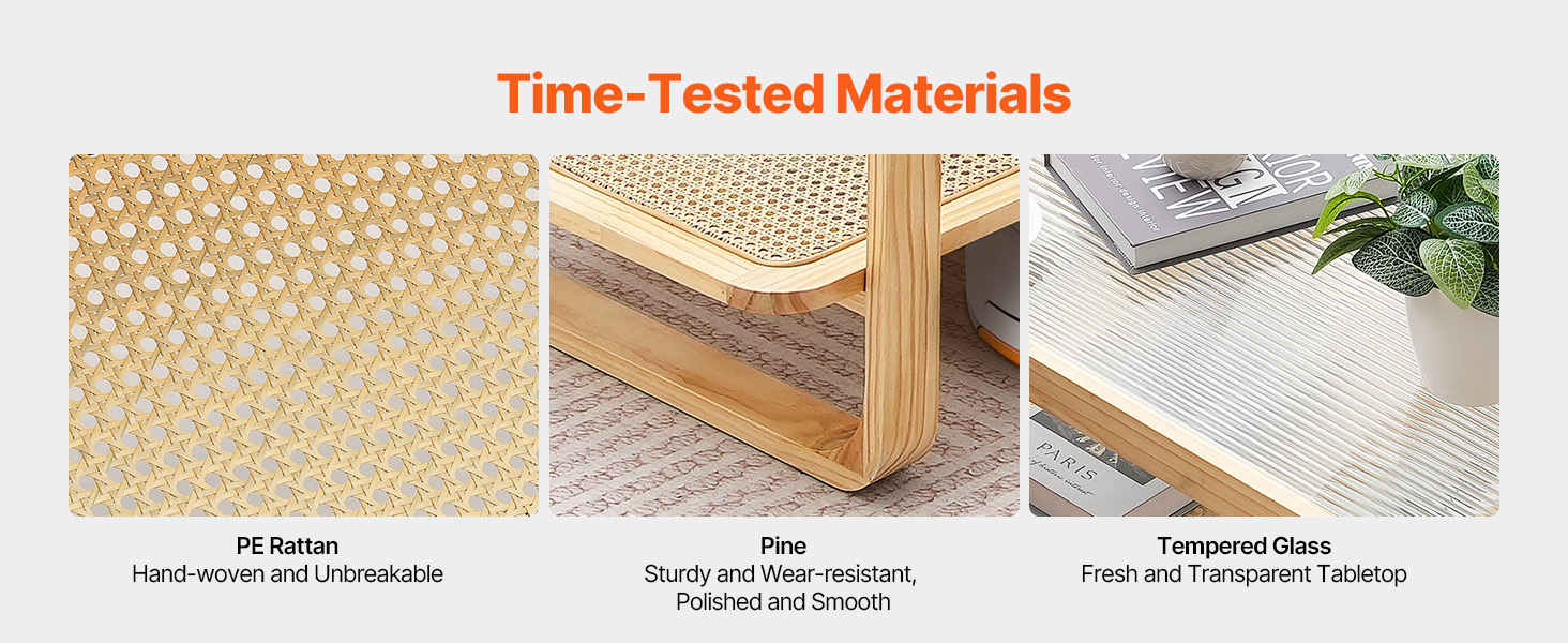 High Quality and Stability: This rectangle rattan coffee table features a clear tempered glass top, natural pinewood, and PE rattan. Its sturdy structure and quality materials provide excellent support, with a weight capacity of 90 lbs (40.8 kg), ensuring it holds various items without wobbling or damage.