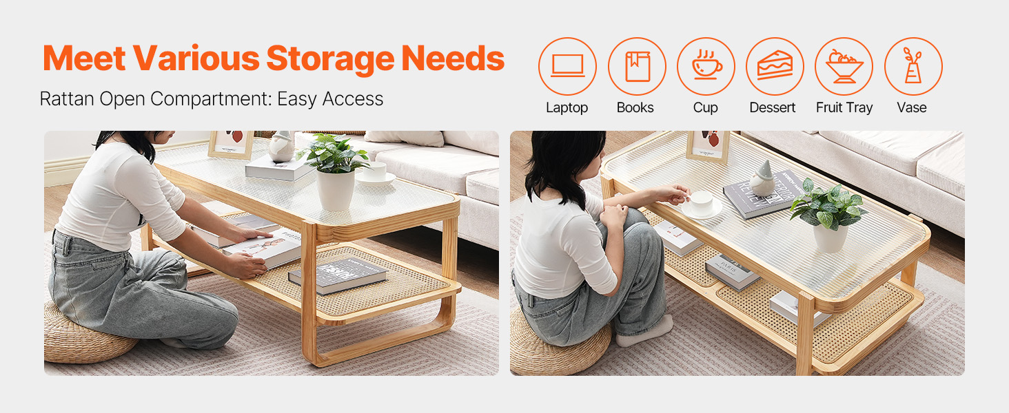 Two-Tier Storage Design: Our boho coffee table offers a two-layer structure, with a tempered glass top for displaying photos, decorations, or laptops and a rattan storage shelf for magazines, books, remotes, or snacks. The different materials blend decoration and functionality, making it beautiful and practical.