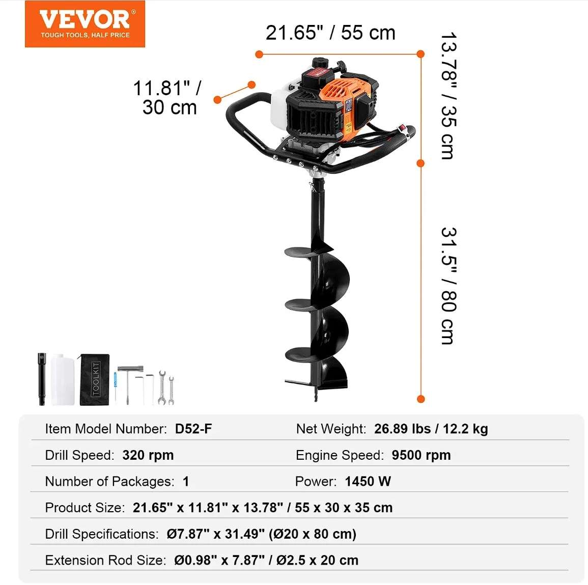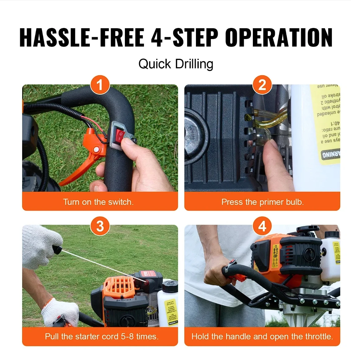 Powerful Power: Equipped with 52cc displacement fuel engine, the power is up to 1450W, the rotational speed can reach 9500rpm, and the drill bit rotates up to 32rpm, combining with the strong engine power, it can finish the drilling task quickly, and can easily deal with all kinds of soil and terrain conditions, which is suitable for heavy-duty work requirements.