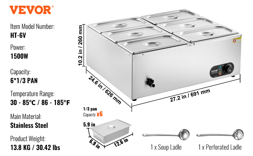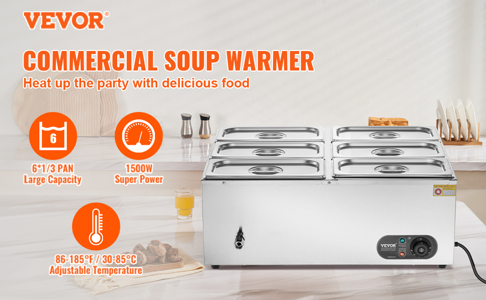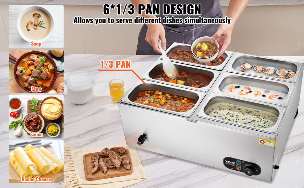 Includes 6 Pans: Our commercial food warmer comes with 6 x 5qt food pans accompanied by their respective lids, allowing you to serve different dishes simultaneously. Feel free to change up your menu from soups and sauces to stew, or even nacho cheese and chocolate.