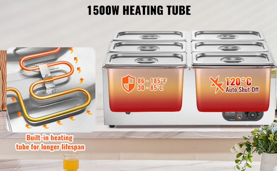 Fast Heating, Lasting Warmth: This impressive food warmer with pans comes with a powerful 1500-watt stainless steel heating tube that rapidly warms up your food to maintain its hot and delicious flavors. You can adjust the temperature output to suit your preference, ranging from 86 - 185℉ / 30 - 85℃, thanks to the temperature controller.