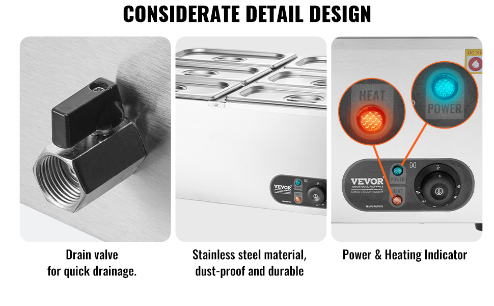 Robust Stainless Steel Build: This food warmer is built to last, with a sturdy all-stainless steel construction that can withstand constant use, and is easy to clean and maintain. The well has a thickened wall (0.03" / 0.8 mm thick) that provides additional sturdiness and has a secure water seal.