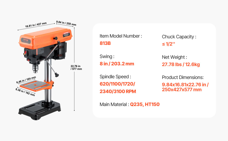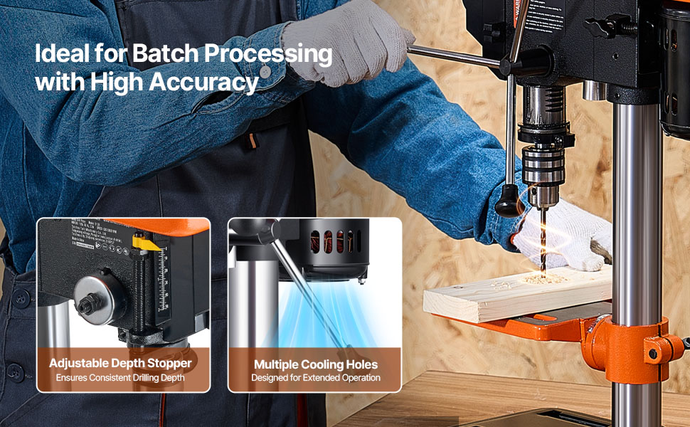 【Precision-Engineered Drilling】: Achieve flawless results with our drill press’s low radial runout and 1/2-inch maximum drilling diameter. The adjustable depth stop and 2-inch spindle travel let you set precise drilling depths for perfect holes every time.