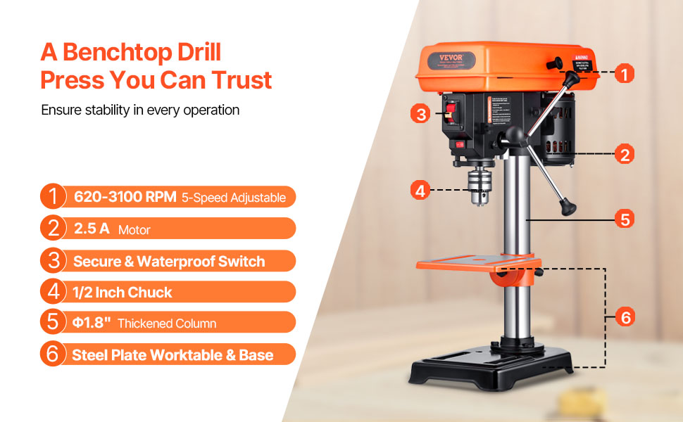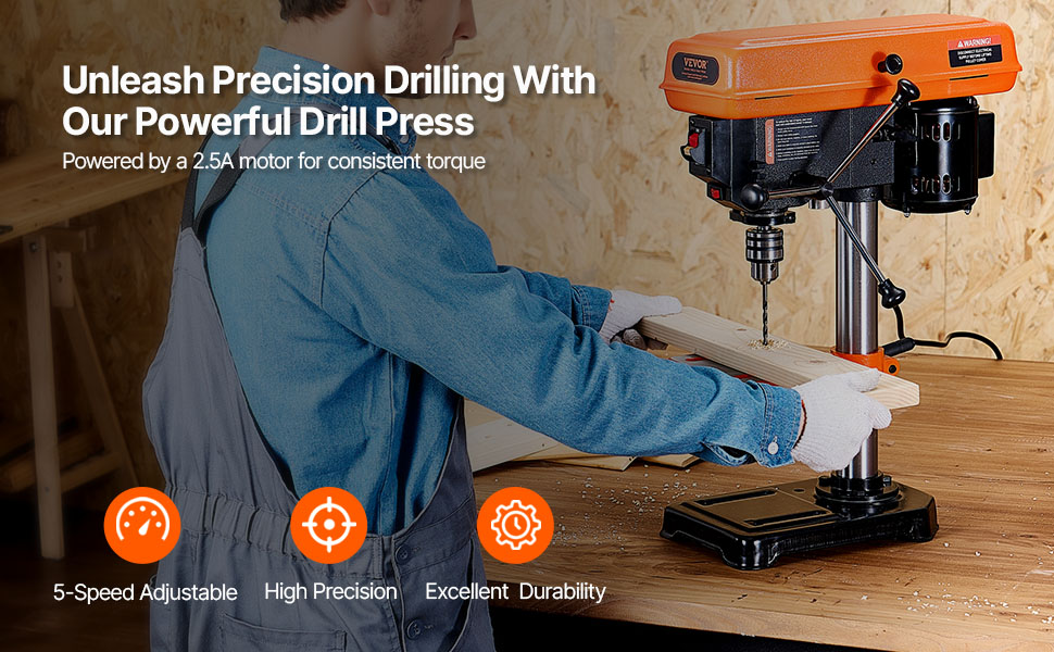 【Exceptional Drilling Performance】: Powered by a robust 2.3A induction motor, this benchtop drill press delivers superior power and stability, ensuring top-notch performance even during extended drilling sessions.