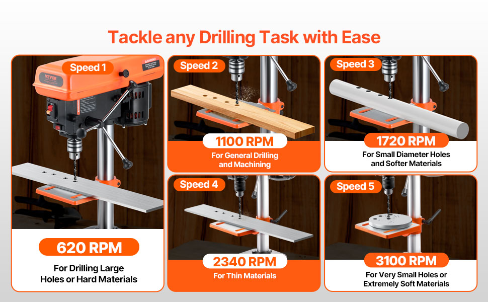 【Variable 5-Speed Control】: Customize your drilling experience with five adjustable speeds ranging from 750 to 3200 RPM (US/CA/MX) / 550 to 2500 RPM (EU/AU). Effortlessly switch between speeds by adjusting the belt, our bench drill press allowing you to tackle a variety of materials and projects with precision.