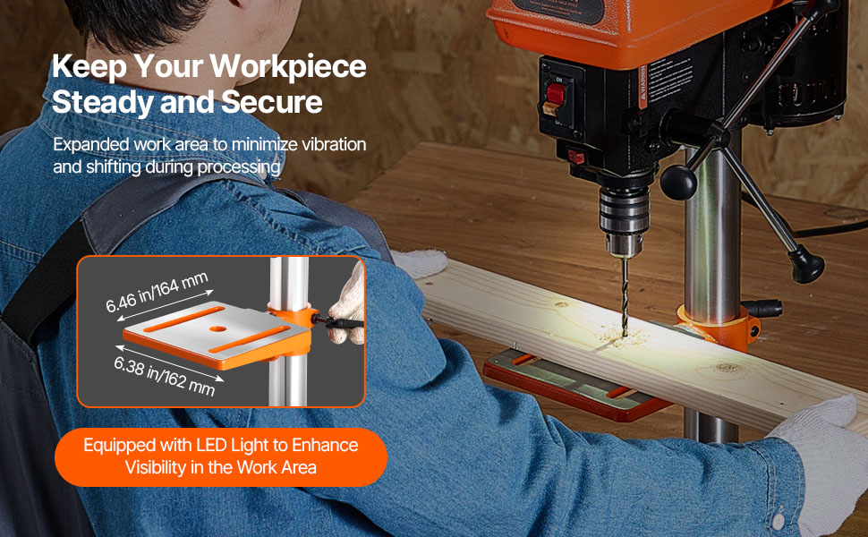 【Bright LED Work Light】: Never miss a detail with the integrated LED work light. Our LED work light of benchtop drill press illuminates your workspace, providing clear visibility and making it easy to work accurately and efficiently even in dimly lit conditions.