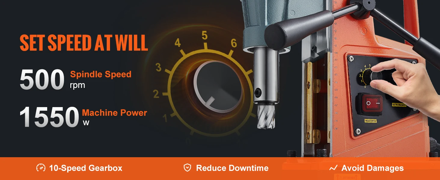 Understand the Power: 2922lbf / 13000N robust force created by the electromagnetic base on the two ends anchors the mag drill press solidly to avoid movement during the drilling process. Adjustable 10-speed gears achieve accurate and efficient operation according to different drilling diameter.