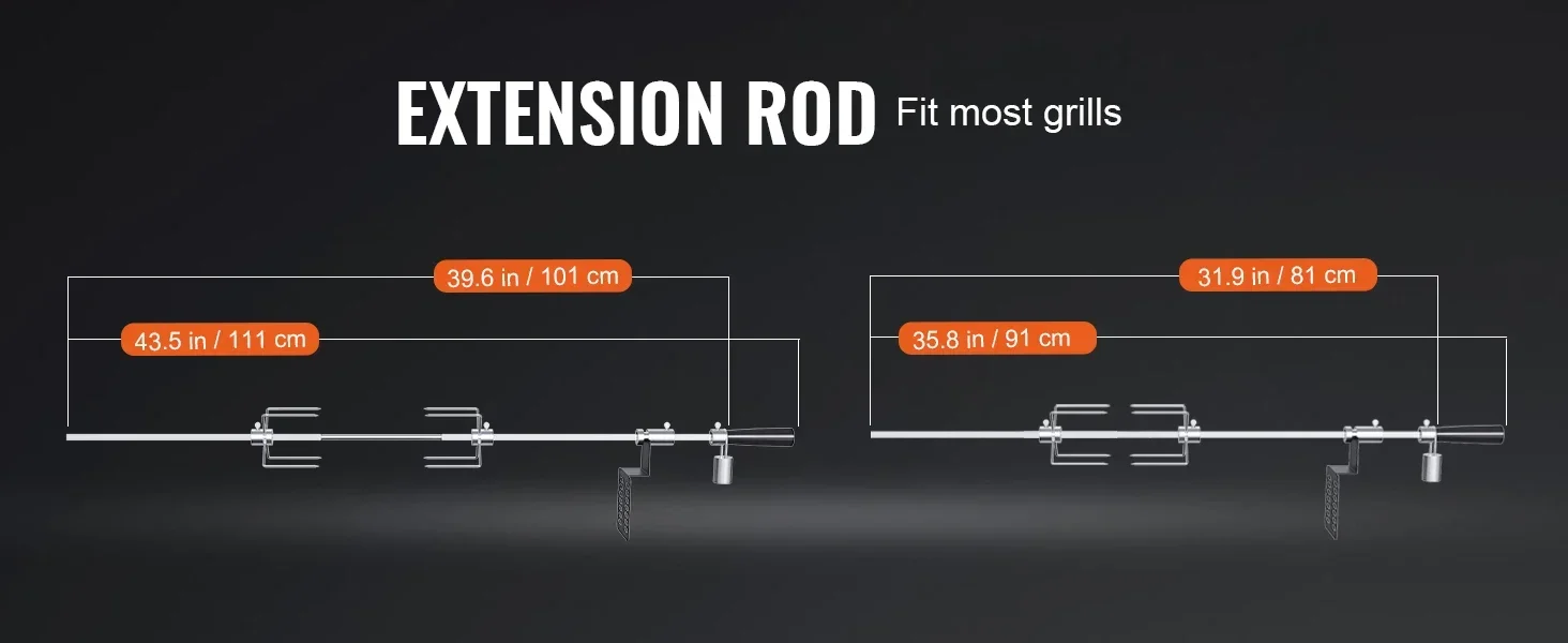 • Dual Connection: You can conveniently use two square spits or connect an extra 7.7-inch round spit to extend it for more versatility in rotisserie cooking. The upgraded design is better suited to meet your needs. The spit rod length is 39.6/31.9 inches (101/81 cm) without the handle.