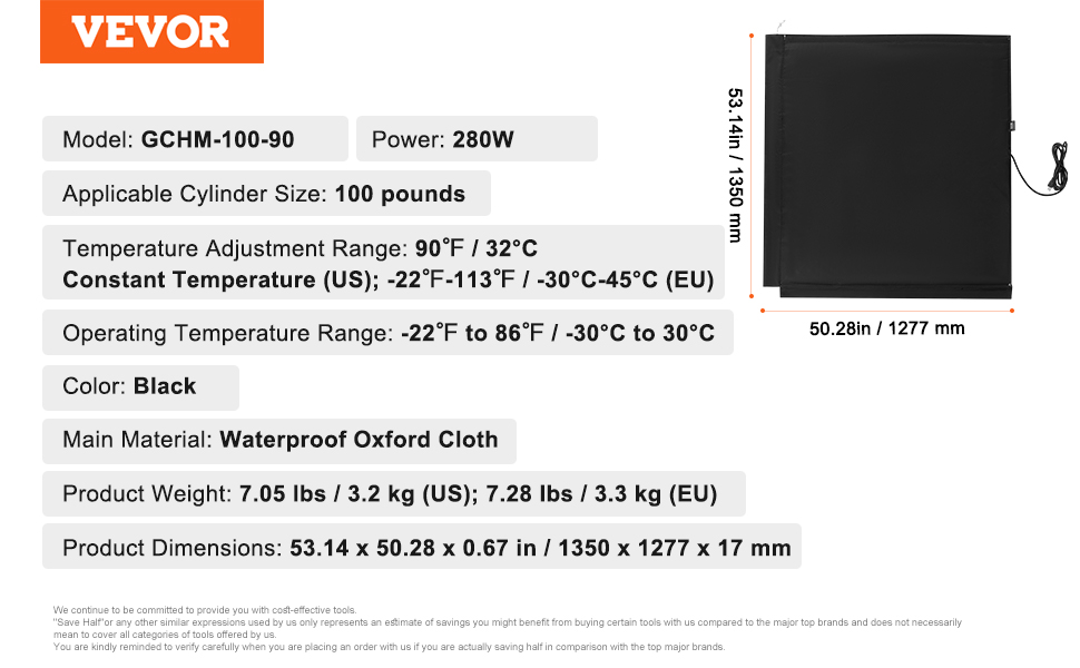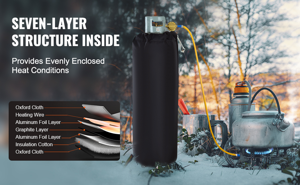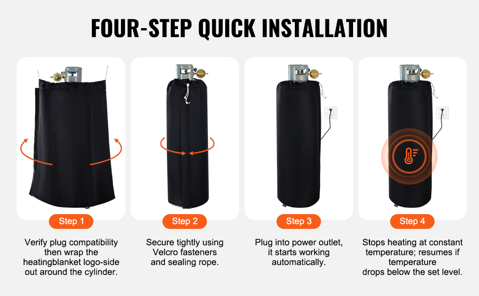 Insulating Full-Wrap Design: The VEVOR propane cylinder heating blanket has a full-wrap, five-layer design (PVC, aluminum film, reflective film, fiber cotton, Oxford cloth) for broader heating. It quickly heats to 90℉ (32.22°C) and maintains a constant temperature, preventing energy waste and ensuring efficient gas output.