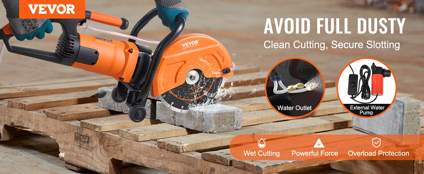 Are you concerned about debris splashing during cutting, which can harm your lungs and vision? The VEVOR electric concrete saw with wet-cutting attachments offers more precise cutting and prevents debris from flying.