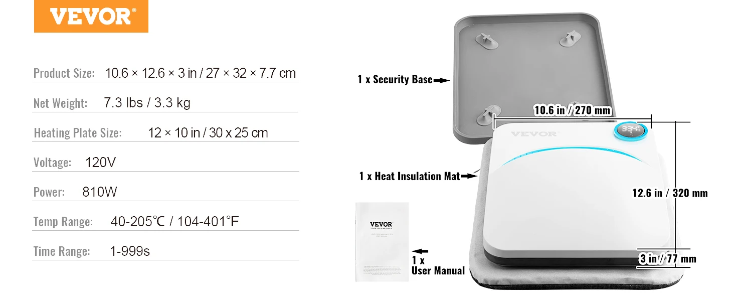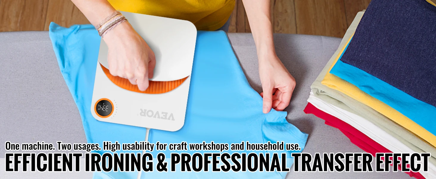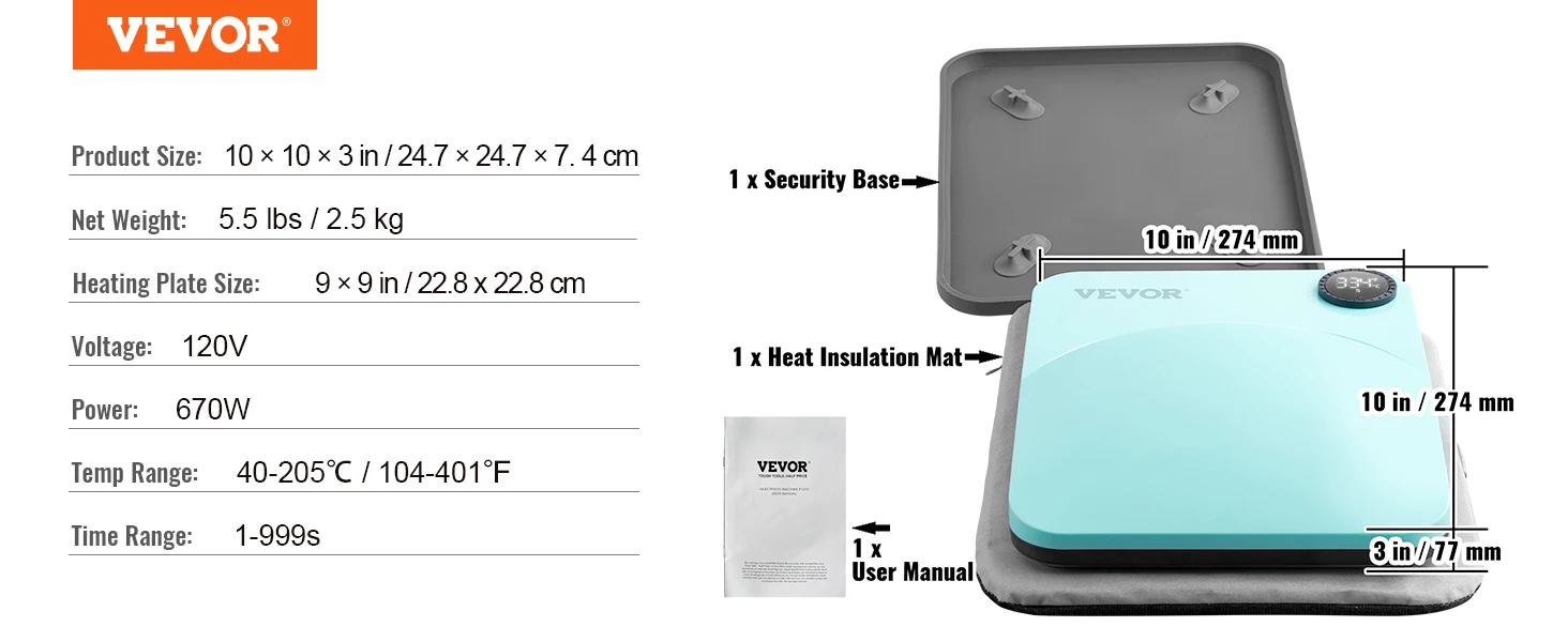 Small But Mighty: This power heat press from VEVOR is ready to create endless patterns on your t-shirts, canvas bags, coasters, pet collars, woodwork, baby blankets, etc. A thinner and lighter body reduces mass production fatigue and the burden of daily storage. Powerful things don't always have to be big.